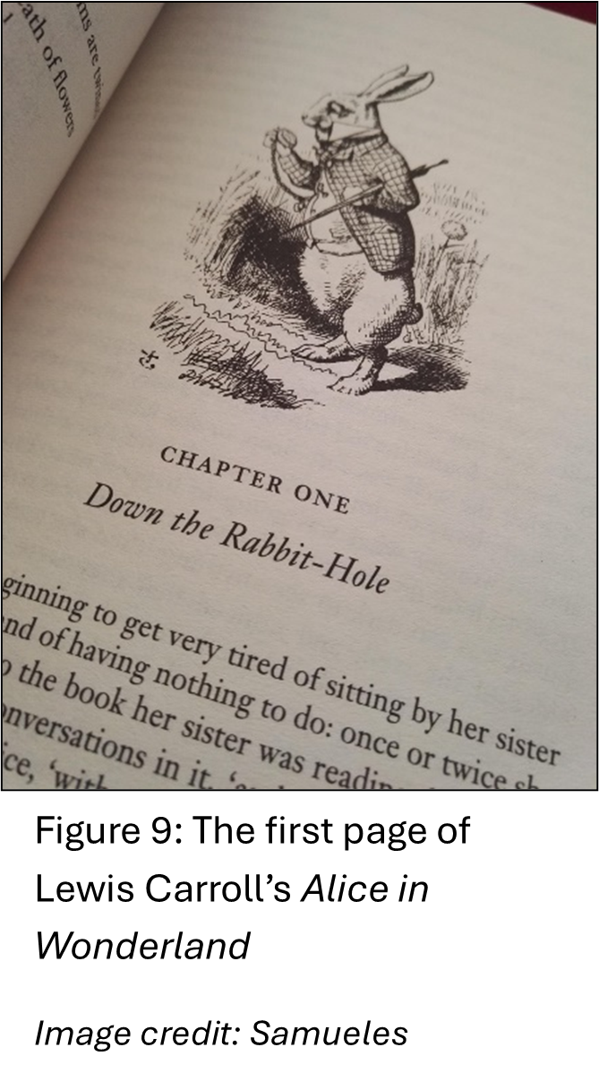 Figure 9: First page of Alice in Wonderland: Samueles. (2017, Oct. 30). Pixabay. Retrieved Dec. 7, 2025 from https://pixabay.com/photos/alice-english-wonderland-rabbit-2902560/