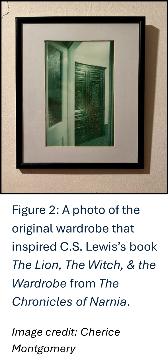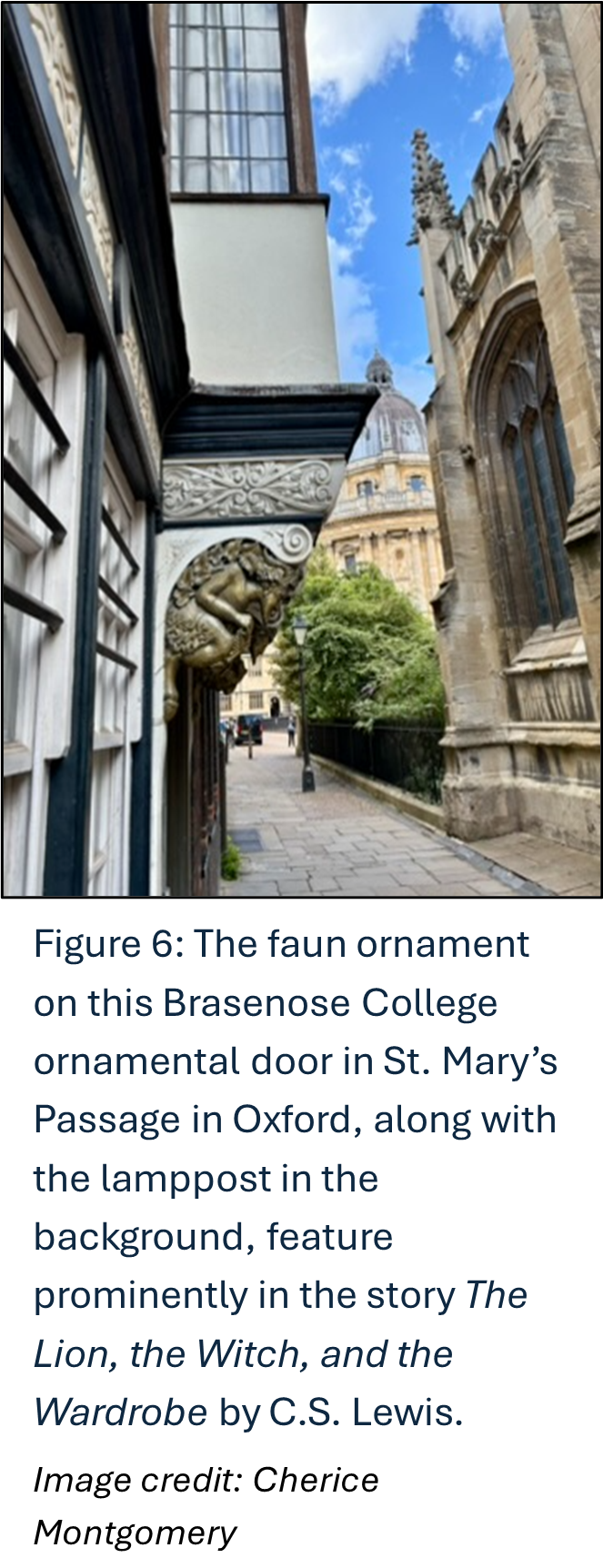 These Oxford writers were enthusiastic meanderers and keen perceivers attuned to even the most inconsequential aspects of their surroundings (Figure 1). Their patterns of careful observation, combined with wild imagination, enabled them to perceive possibility where others only saw pedestrian routine. There was no separation between the mundane elements of their lives and their work. In fact, their work grew from the seeds of those ordinary details. Thus, wardrobes became gateways to enchanted kingdoms (Figure 2); trees and statues morphed into fantastical creatures (Figures 3-7); and college gardens transformed into magical wonderlands (Figures 8-9).