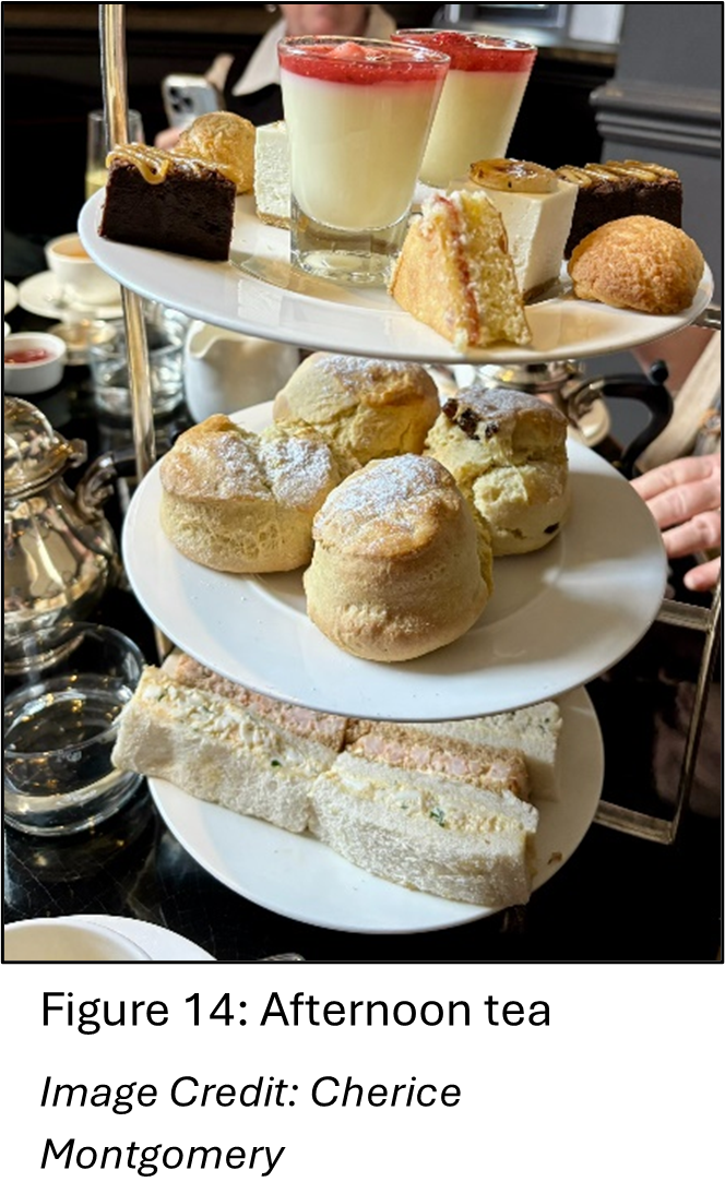 In literature, afternoon tea is often portrayed as a quaint social activity that connotes propriety and sophistication. The UK’s affinity for it only makes sense after one has personally experienced the nation’s perpetual rain (Figure 12), pervasive dampness, and the chilly discomfort of stone buildings that pre-date the 16th century. Far more than just a charming cultural custom, drinking tea is a logical response to the daily realities of life there (Figures 13-14). During the Mad Hatter’s tea party in Alice’s Adventures in Wonderland (Figure 15), Lewis Carroll satirizes this and other well-established cultural customs (e.g., personal space, courtesy, indirect communication, and punctuality) to demonstrate the irrationality of relying on social convention to evaluate the quality of one’s life or the degree of one’s sanity.